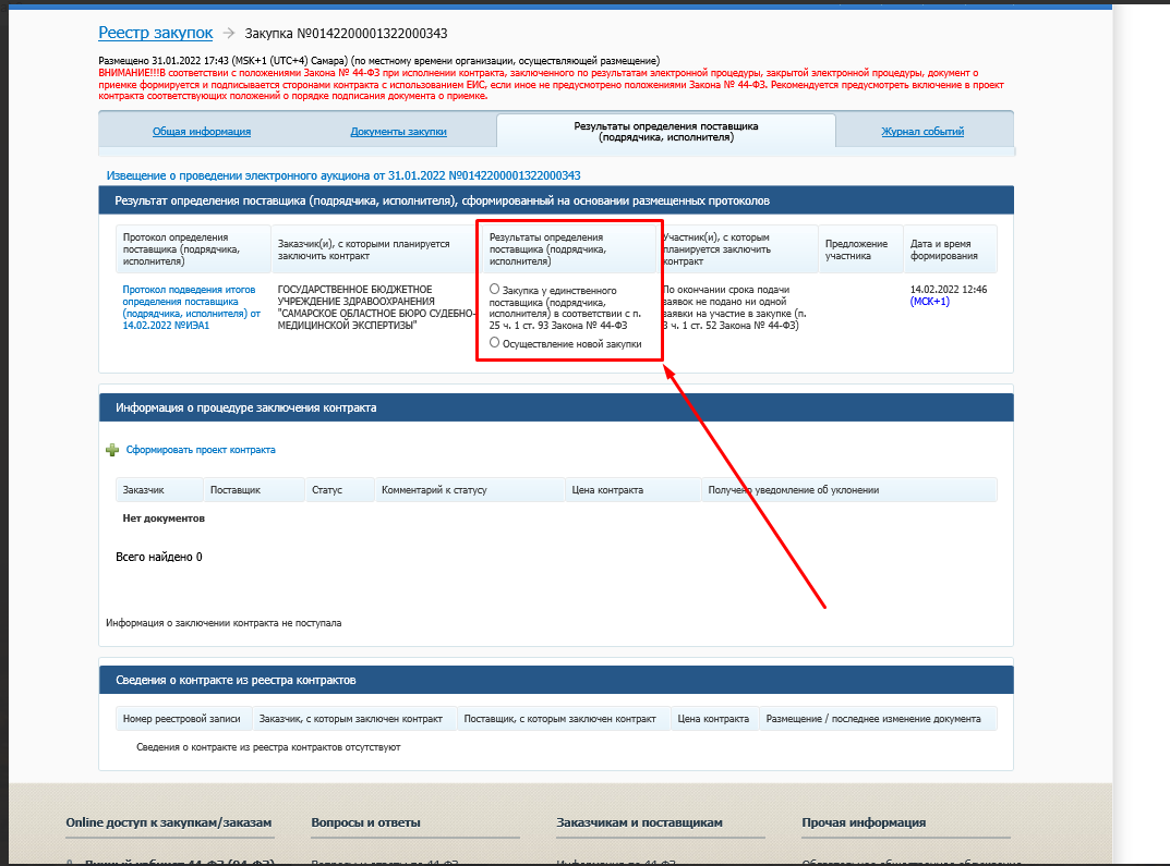 В первую очередь следует проверить состояние связанного с контрактом извещения в ЕИС. Извещение должно находиться на этапе «Работа комиссии» или «Определение поставщика завершено».